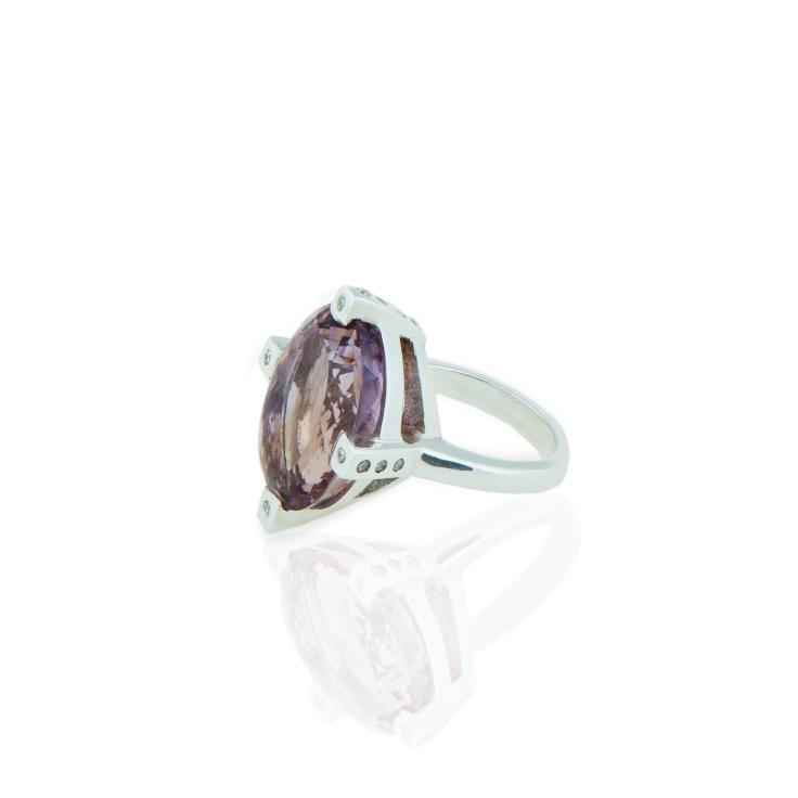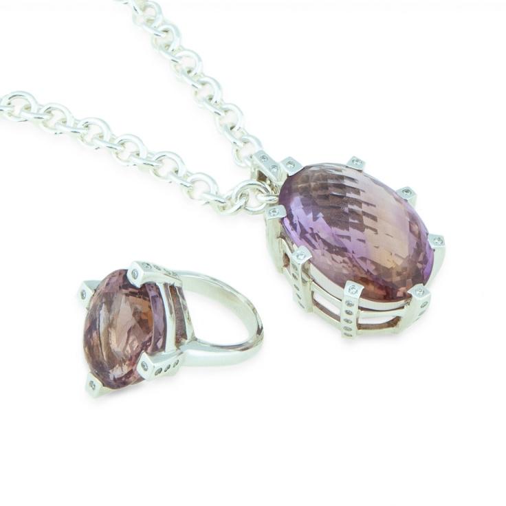 Ametrine is one of my favorite stones on the planet as it has the healing strength of citrine and amethyst grown naturally in the same crystal. It's outstanding to feel and to see with all of the high-grade VS diamond accents firing like stars! The heavy contemporary style is a design language of universal form, heavy, protective, and gorgeous, making all of our Treasures hand-made pieces wearable by men and women.