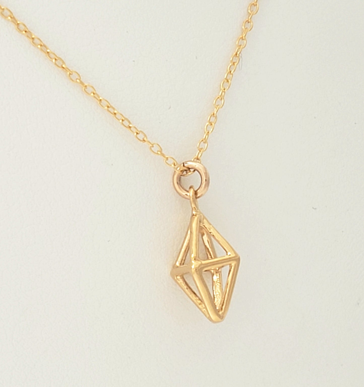 The Octahedron Cage pendant is small but protective and helpful for finding core strength. The octahedron is a platonic solid as well as the building block of life. The proteins that make up our DNA are stacked in octahedron form. This pendant was carved then cast in fine sterling. It's the perfect powerful little pendant for everyday wear!
