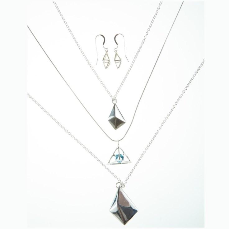 The Octahedron Cage Earring is an amazing contemporary dangle that's amazing for everyday wear. This platonic solid and structural symbol found throughout nature was hand carved then cast in fine sterling silver. Octahedrons are powerful sacred forms that have been used for thousands of years to harness energy from the earth. Its also used for directing energy and consciousness, for energetic protection, and for emotional strengthening. The octahedron is a platonic solid which means it's a building block of life. The proteins that make up our DNA are stacked in octahedron form as well. These cute and powerful earrings are hung on sterling french wires. Order your Octahedrons today!
